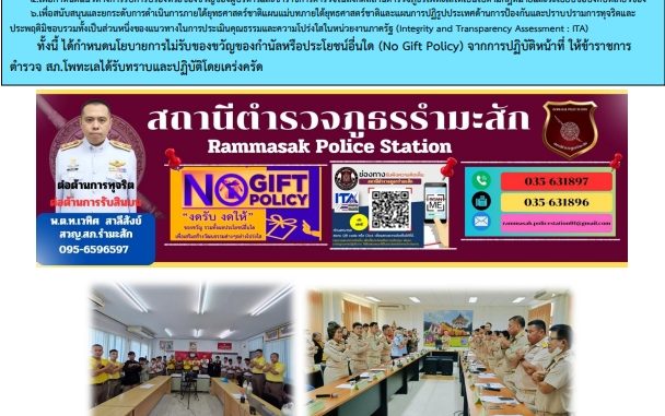 ทั้งนี้ ได้กำหนดนโยบายการไม่รับของขวัญของกำนัลหรือประโยชน์อื่นใด (No Gift Policy) จากการปฏิบัติหน้าที่ ให้ข้าราชการตำรวจ สภ.รำมะสัก ได้รับทราบและปฏิบัติโดยเคร่งครัด