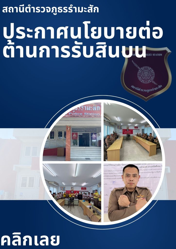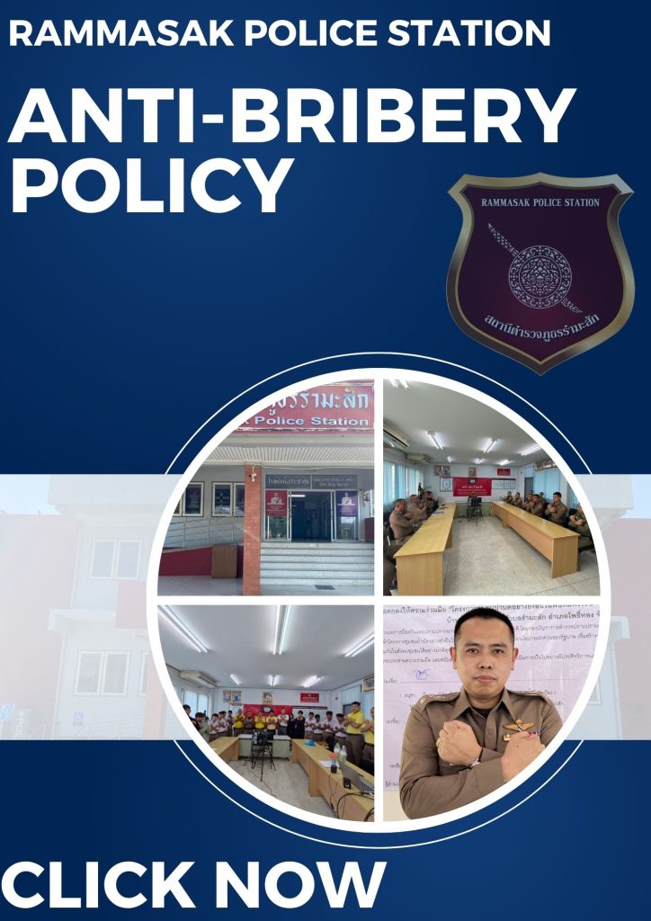 O18 : ประกาศนโยบายต่อต้านการรับสินบน ( Anti-Bribery Policy) ประกาศนโยบายต่อต้านการรับสินบน ( Anti-Bribery Policy) คลิ๊กเพื่อโหลดไฟล์แบบ PDF >>> สถานีตำรวจภูธรรำมะสัก No Gift Policy 2568 ประกาศนโยบายต่อต้านการรับสินบน ( Anti-Bribery Policy) Ver.English คลิ๊กเพื่อโหลดไฟล์แบบ PDF >>> แบบฟอร์ม No Gift Policy 2568 แปล อังกฤษ ประกาศเจตนารมณ์ที่จะไม่รับของขวัญหรือของกำนัลทุกชนิดจากการปฏิบัติหน้าที่ คลิกเลย >> ประกาศเจตนารมณ์ที่จะไม่รับของขวัญหรือของกำนัลทุกชนิดจากการปฏิบัติหน้าที่ CLICK NOW >> Rammasak Police No Gift Policy 2568 Ver.English การเผยแพร่ ณ จุดบริการประชาชน การประชาสัมพันธ์ No Gift Policy บนสถานีตำรวจภูธรรำมะสัก FacebookFacebookXXLINELine