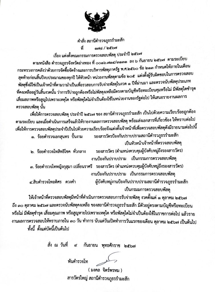O23 : การจัดการทรัพย์สินของราชการ ของบริจาค การจัดเก็บของกลาง และแนวทางการนำไปปฏิบัติ 1.การจัดการทรัพย์สินของทางราชการและของบริจาค คลิ๊กเพื่อดูไฟล์ >> ประกาศการจัดการ ทรัพย์สิน สภ.รำมะสัก ปี 68 ข้อสั่งการสำนักงานตำรวจแห่งชาติเรื่องการจัดการอาวุธปืนของทางราชการ0007.22-1992 ลง 11 พ.ค.65 กำชับการปฏิบัติเกี่ยวกับอาวุธปืนของ ตร.เอกสารอ้างอิง 1 0008.421/ว 44 ลง 30 ก.ย.59- กำชับการปฏิบัติและกำหนดมาตรการในการควบคุม และการตรวจสอบเกี่ยวกับการใช้อาวุธปืนของทางราชการเอกสารอ้างอิง 2 หนังสือ สง.รอง ผบ.ตร.(ปป) ที่ 0001(ปป)-4 ลง 2 ต.ค.64 – มอบอำนาจหน้าที่ความรับผิดชอบในงานป้องกันปราบปรามอาชญากรรม (ปป)เอกสารอ้างอิง 3 0007.22-3407 ลง 5 พ.ย.64 – ให้ตรวจสอบอาวุธปืนและเครื่องกระสุนปืนแบบรายงานผลการตรวจสอบสถานภาพอาวุธปืน แสดงการวางระบบการดูแลจัดการทรัพย์สินเพื่อป้องกันการนำทรัพย์สินของทางราชการและของบริจาคไปใช้เพื่อประโยชน์ส่วนตน โดยมิชอบจำแนกประเภททรัพย์สินของทางราชการ อาวุธยุทภัณฑ์ และของบริจาคกำหนดแนวทางควบคุม กำกับดูแลรักษา ตรวจนับ ตรวจสอบสภาพการใช้งานทรัพย์สินของราชการ ของบริจาคโดยเฉพาะทรัพย์ประเภทที่มีความเสี่ยงในการนำไปใช้โดยมิชอบตรวจสอบและตรวจนับอาวุธยุทธภัณฑ์ของสถานีตำรวจเพือ่ให้มีความพร้อมต่อการใช่งานในภารกิจประจำวันแนวทางการปฏิบัติ 2.การจัดเก็บของกลางระเบียบที่เกี่ยวข้องระเบียบ ตร. ว่าด้วยการเก็บ รักษา และการจำหน่ายของกลาง พ.ศ.2565 คลิ๊กที่นี่ จัดทำคำสั่งเจ้าหน้าที่ตรวจสอบพัสดุ สภ.รำมะสัก ดูไฟล์แบบ PDF คลิ๊กด้านล่างคณะกรรมการตรวจสอบพัสดุ สมุดควบคุมสิ่งของหลวง การตรวจสอบทรัพย์สินของทางราชการของ สภ.รำมะสัก เอกสารรายงานผลการปฏิบัติเกี่ยวกับการจัดการทรัพย์สินของทางราชการ ของบริจาค การจัดเก็บของกลาง (คลิ๊กดู ประจำเดือน ล่างนี้) สภ.รำมะสัก สรุปผลการตรวจสอบพัสดุ ตุลาคม 67สภ.รำมะสัก สรุปผลการตรวจสอบพัสดุ พฤศจิกายน 67สภ.รำมะสัก สรุปผลการตรวจสอบพัสดุ ธันวาคม 67สภ.รำมะสัก สรุปผลการตรวจสอบพัสดุ มกราคม 68สภ.รำมะสัก สรุปผลการตรวจสอบพัสดุ กุมภาพันธ์ 68สภ.รำมะสัก สรุปผลการตรวจสอบพัสดุ มีนาคม 68 คำสั่งมอบหมายหน้าที่การเก็บรักษาของกลาง (คดีอาญาและคดีจราจร) สภ.รำมะสัก ดูไฟล์แบบ PDF คลิ๊กด้านล่างคำสั่งมอบหมายเจ้าหน้าที่รับผิดชอบของกลาง การเก็บรักษาของกลาง FacebookFacebookXXLINELine